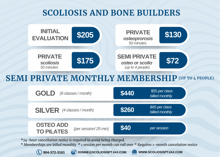 At ScoliosisPTJax we offer a free discovery visit for us to learn more about you and to develop a program unique to you. We work one-on-one with each of our clients without the “restrictions placed on therapists by insurance companies”.